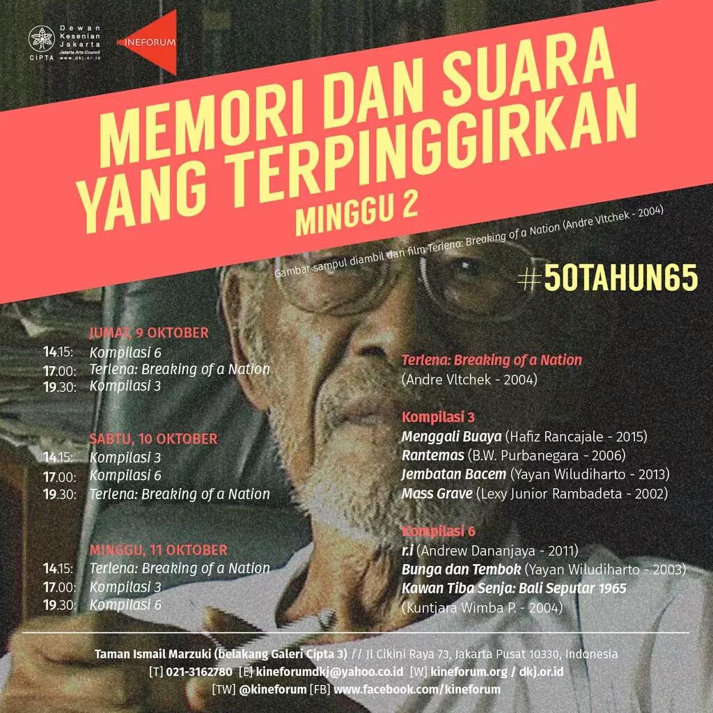 Tahun ini, Indonesia memperingati 50 tahun kejadian berdarah di tahun 1965. Kala itu, adalah masa awal pemerintahan orde baru yang dipimpin Soeharto. Ketika itu pula, terjadi peristiwa memilukan yang melibatkan kematian 500 ribu sampai lebih dari dua juta orang Indonesia. Bahkan kejadian itu disebut-sebut genosida terbesar kedua di abad ke-20 setelah pembantaian yang diotaki Hitler. Sementara di Jerman sejumlah museum dan monument penting diabadikan untuk jadi bahan pelajaran bagi generasi muda Jerman berikutnya, bagaimana Indonesia belajar dari masa lalunya?Kine Forum Jakarta menolak lupa dengan menayangkan seri film yang berkisah tentang peristiwa G30S. Selama satu bulan penuh, tiap akhir pekan kita bisa menyaksikan puluhan judul tentang itu. Dua hari terakhir, ada lima judul yang saya saksikan. Empat di antaranya dihimpun dalam kompilasi 3. Mereka adalah Menggali Buaya (2015), Rantemas (2006), Jembatan Bacem (2013) dan Mass Grave (2002). Satu film documenter yang saya tonton sehari setelahnya, berjudul Terlena: Breaking of a Nation (2004).